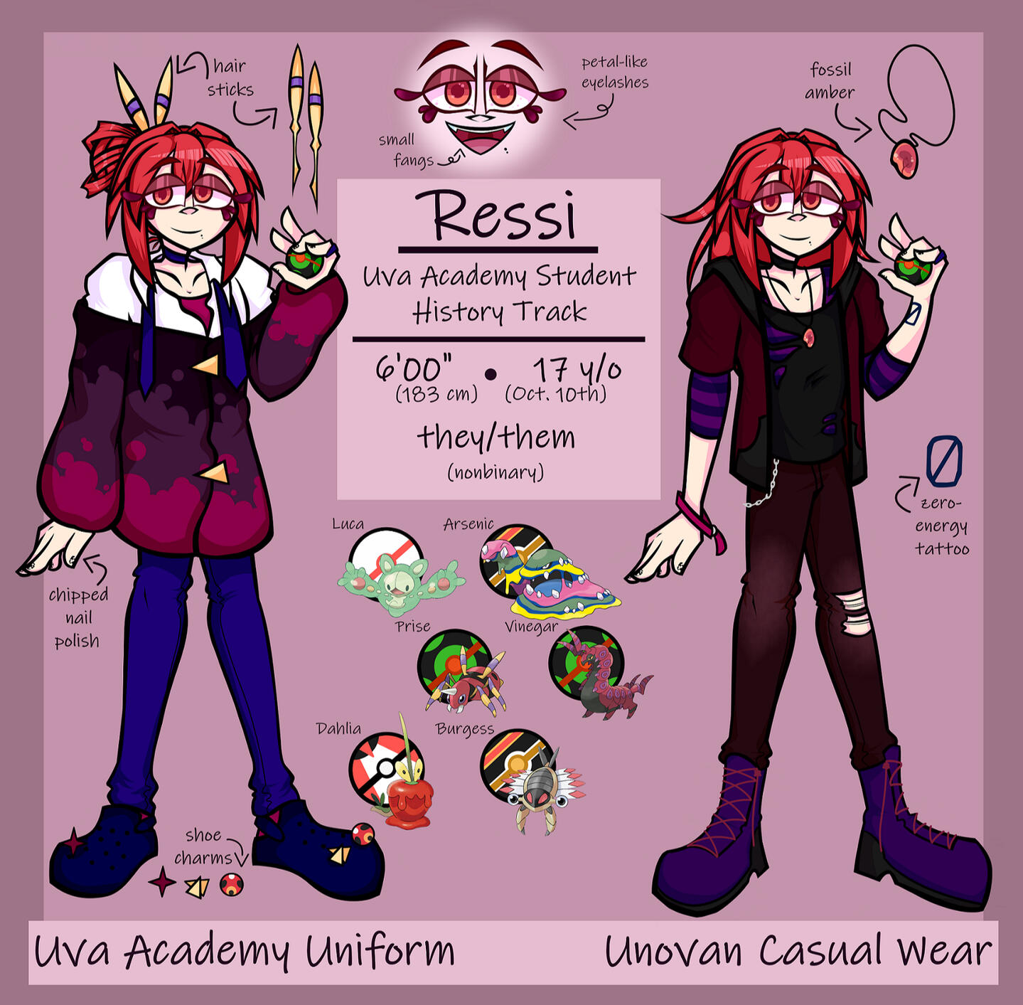 RESSI is a Unovan transfer student at Uva Academy in Paldea, transferring from Blueberry Academy in their junior year. Ressi is struggling academically, feeling as if they cannot study their true passion -- history -- due to familial pressure to be a competitive trainer. while being in Paldea is lonely, it is also freeing; and the bonds they make during tutoring support them in their interests.